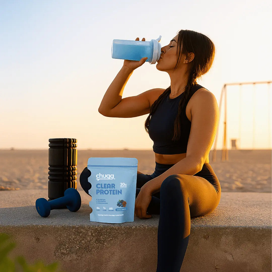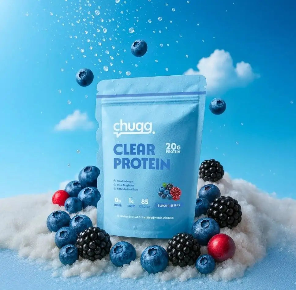 Chugg Clear Protein is a light, refreshing protein powder that mixes like a sports drink or juice, not a thick protein shake. It gives you 20g of clean protein with none of the heaviness, bloating, or chalky texture of traditional shakes.